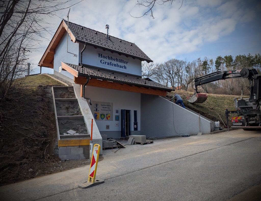 Im Portalbereich des Hochbehälters Grafenbach wurde die Randzone grundlegend erneuert. Durch die Neugestaltung kann Regenwasser nun kontrolliert einsickern/abfließen, wodurch unkontrollierte Ausspülungen und Rinnenbildung im Hangbereich effektiv verhindert werden.