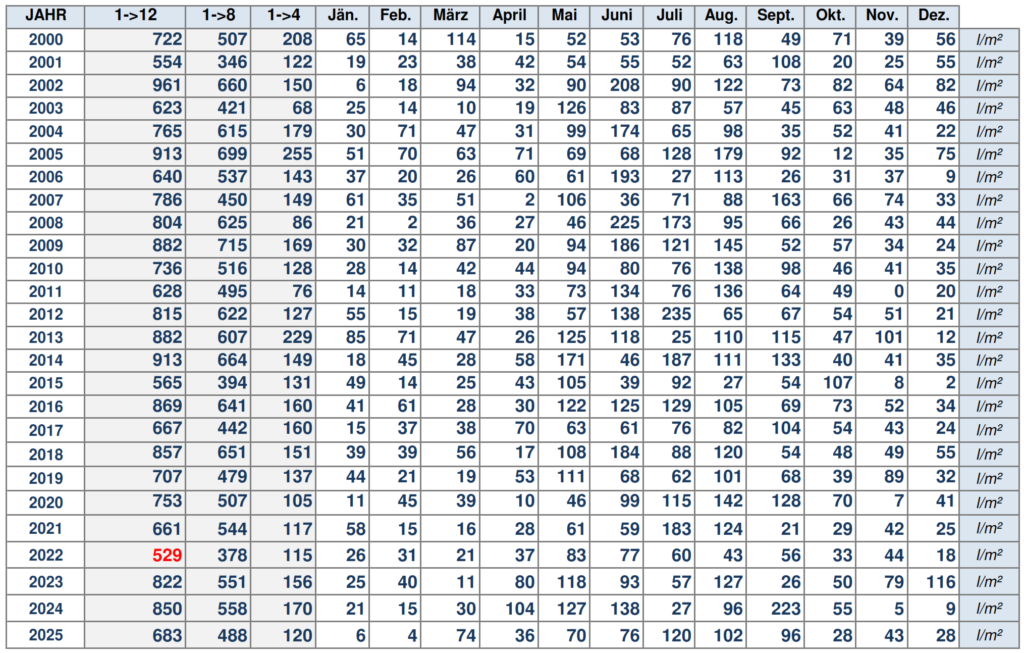 Niederschlagswerte GEOSPHERE Messstelle Pottschach Klicken Sie auf das Bild für eine größere Ansicht.Tiefstwert 2022 Klicken Sie auf das Bild für eine größere Ansicht.